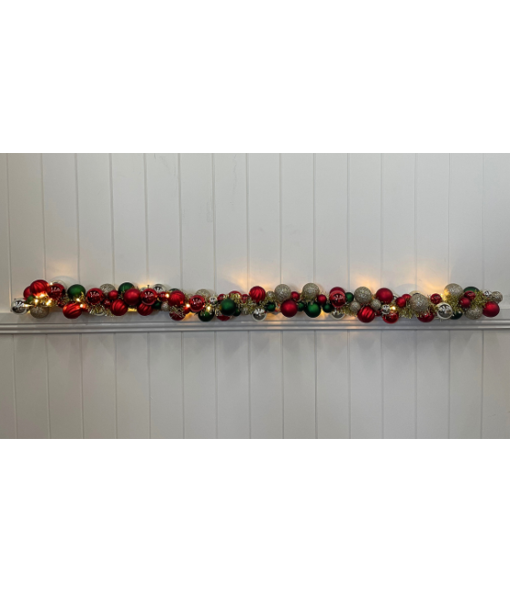 The “1.5m Pre-lit Red, Gold, and Green Bauble Garland” is a pre-decorated garland that comes with a mixture of traditional baubles and tinsel. This is a pre-lit garland with warm white string lights and comes with a battery pack. It can be hung on the face of a wall or a mantle, styled on a table front or attached to almost anything you would like to decorate with this simple and modern looking foliage.
